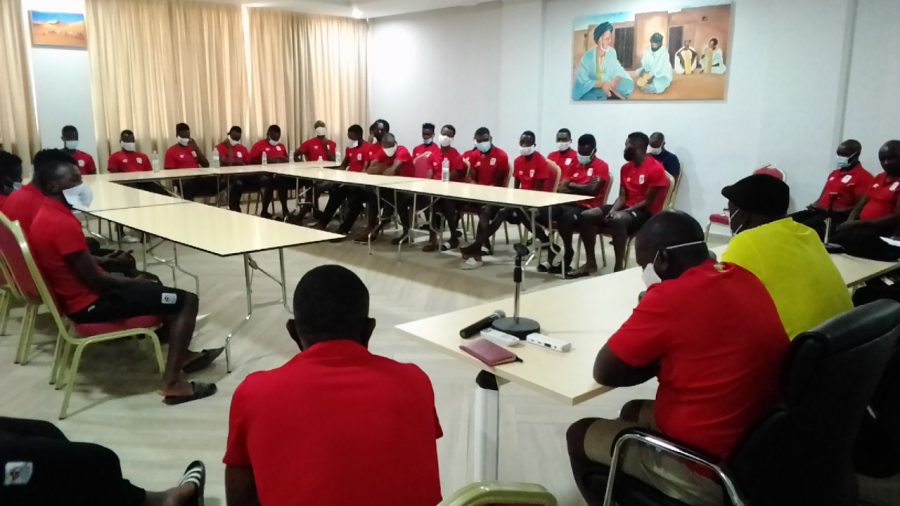 FUFA EXCO Member Rogers Mulindwa (Yellow) talking to Uganda Hippos Players at Sunset Hotel in Mauritania