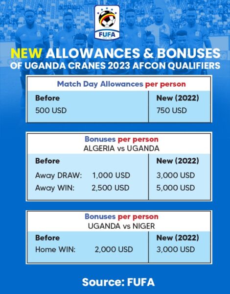 The new figures cater for the match day allowances and bonuses for each team member (players and officals) as Uganda prepares to take on Algeria tonight in Algiers and Niger next week.