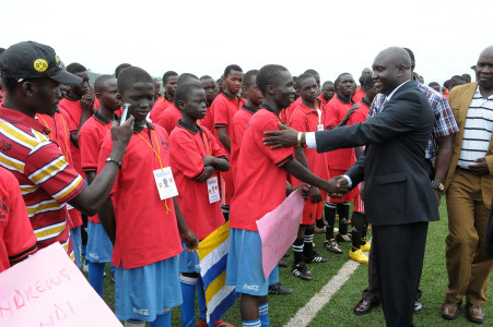 FUFA President Lawrence Mulindwa shakes hands with participating players at the official opening of his Presidential U16 Youth Cup at the Technical Centre in Njeru.