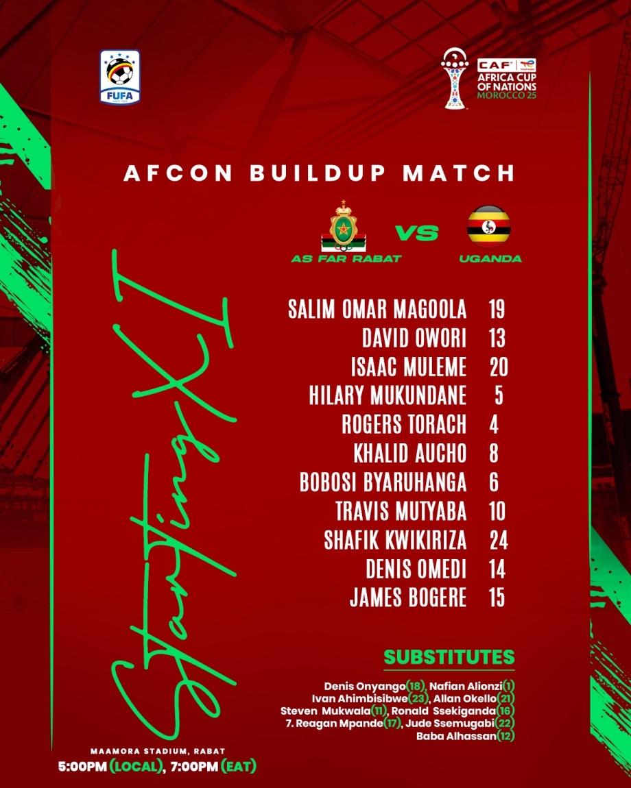 Salim Jamal was replaced by Alionzi Nafian, Khalid Aucho made way for Ronald Ssekiganda, Allan Okello replaced Travis Mutyaba, James Bogere was substituted by Ivan Ahimbisibwe, while Reagan Mbande replaced Shafik Nana Kwikiriza.