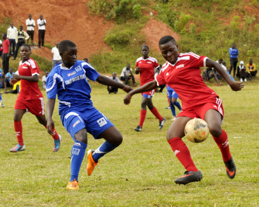 Kawempe Muslim’s Sandra Nabweteme (right) in action against Kakungulu Memorials’ Ruth Akuku in the Kampala District semi finals played on monday 30 May 2015 at Kawempe Muslim playground. Kawempe advanced on penalties 2-0 after coming from behind to equalize and force 1 all draw in normal time.