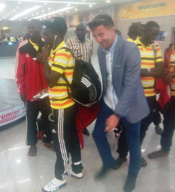 Uganda Kobs head coach, Milutin Sedrojevic with the players at the Airport in Mozambique