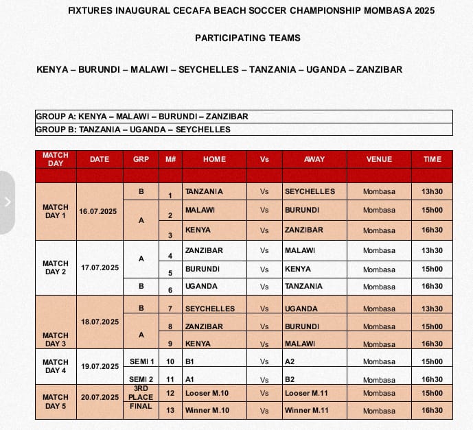 The tournament will be held from 16th to 20th July 2025 at Pirates Beach in Mombasa, Kenya. The official draws and match fixtures were released by CECAFA Executive Director, Auka Gecheo.