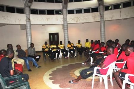Uganda Hippos players attentively listen to the FUFA President, Eng. Moses Magogo