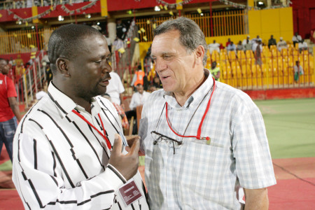 Muyeshi (left) chats with TP Mazembe head Coach Dirgo Garzito during the Cecafa club Championship in Khartoum, Sudan in 2009.