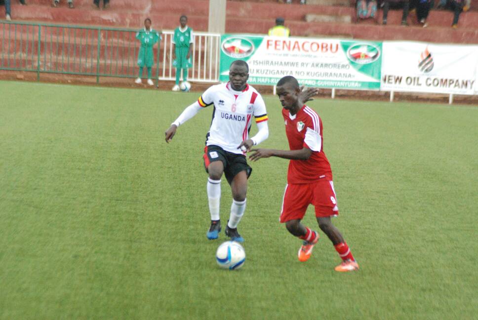 Kirya Gerald closes in on a Sudanese player during the game in Gitega