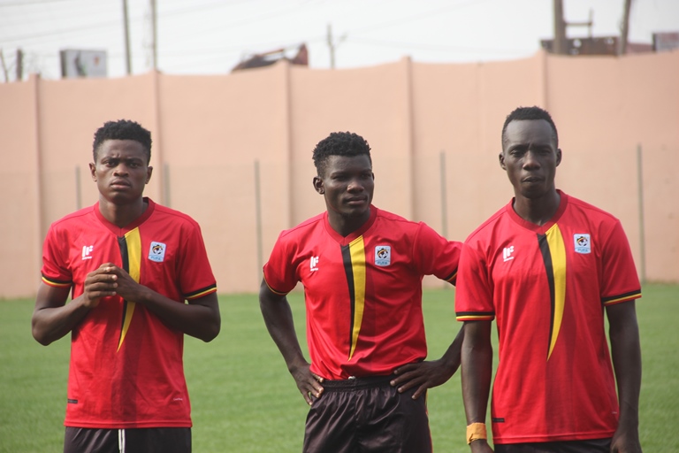 Eric Ssenjobe stands between his teammates at Cranes Bobosi Byaruhanga (L) and Hassan Muhamud (R) before the Uganda vs Zambia match in Yaounde. He is standing akimbo but the shirt still tucked in.