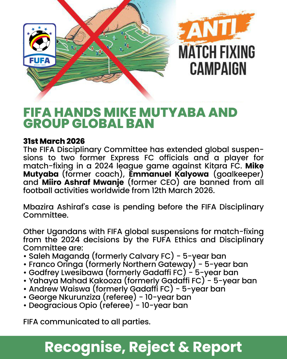 Mike Mutyaba (former coach), Emmanuel Kalyowa (goalkeeper) and Miiro Ashraf Mwanje (former CEO) are banned from all football activities worldwide from 12th March 2026.