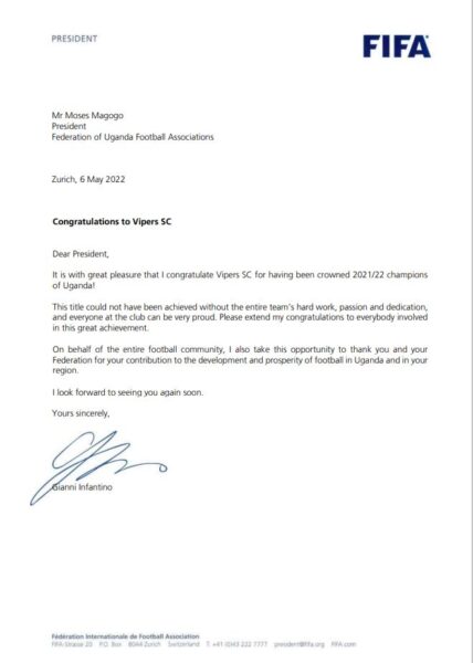 The Champions elect of the StarTimes Uganda Premier League Vipers SC have received a Congratulatory message from FIFA President Gianni Infantino for clinching their 5th title in the top flight.