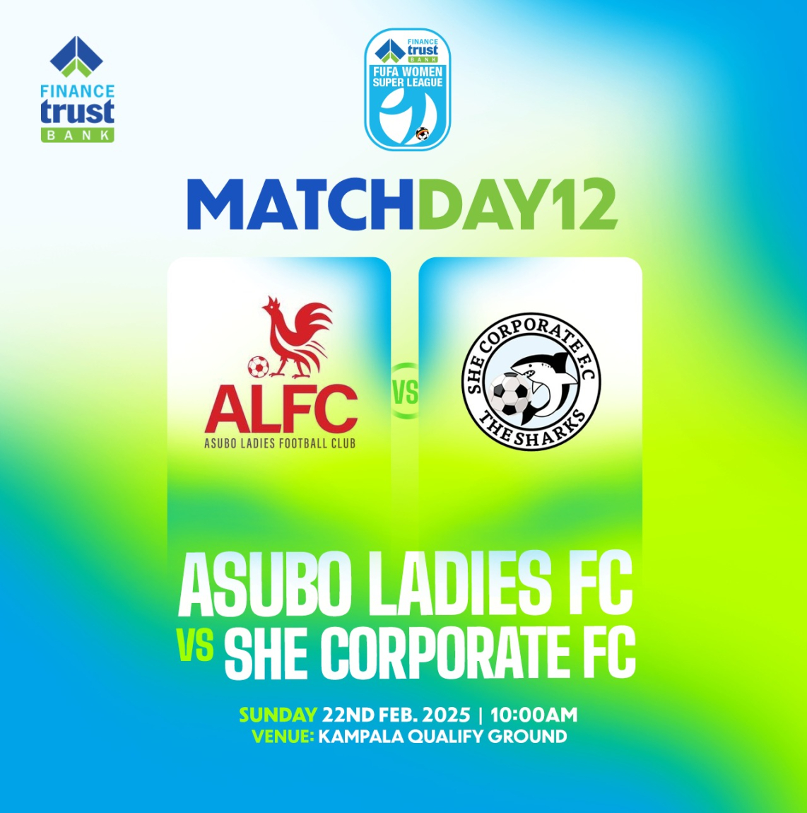 Second placed She Corporate FC wrap up the weekend with a trip to Kampala Quality Ground to face Asubo Ladies FC, who sit second from bottom on four points and are fighting to revive their season.