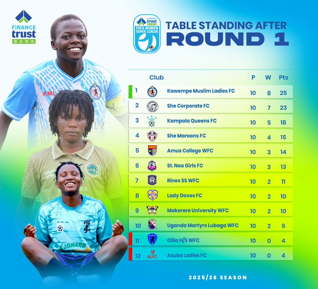 After a tightly contested first round, record champions Kawempe Muslim Ladies FC lead the standings with 28 points from 11 matches, closely followed by She Corporate FC on 26. Defending champions Kampala Queens FC remain firmly in contention with 21 points, with only few points separating the top sides, the second round is set up for an exciting battle for the title.