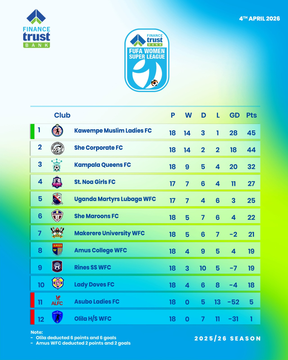 Matchday 18 of the Finance Trust Bank FUFA Women Super League delivered thrilling action, with title contenders Kawempe Muslim Ladies FC and She Corporate FC reinforcing their positions at the summit. Both sides secured crucial victories, ensuring the championship race remains fiercely contested as the season edges closer to its conclusion.