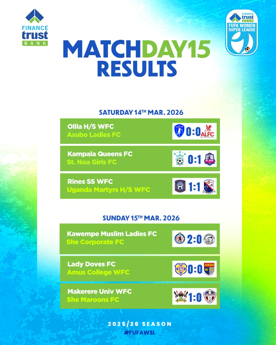 Elsewhere on Matchday 15, Makerere University WFC secured a narrow 1–0 victory over She Maroons FC at the Nsibirwa Ground, while Lady Doves FC and Amus College WFC played out a goalless draw at Katusabe Ground in Masindi.