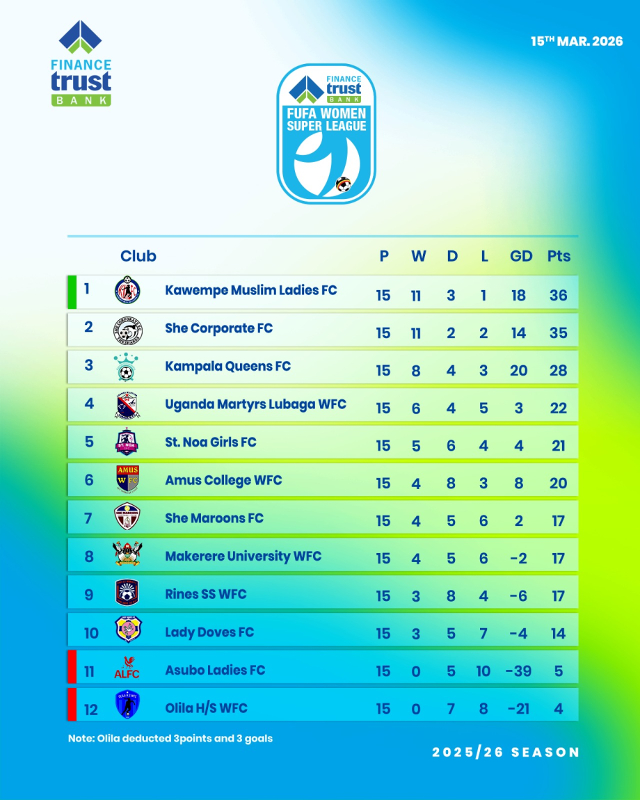 Matchday 15 of the Finance Trust Bank FUFA Women Super League concluded with Kawempe Muslim Ladies FC reclaiming the top spot after a commanding 2–0 victory over She Corporate FC in a highly anticipated encounter.