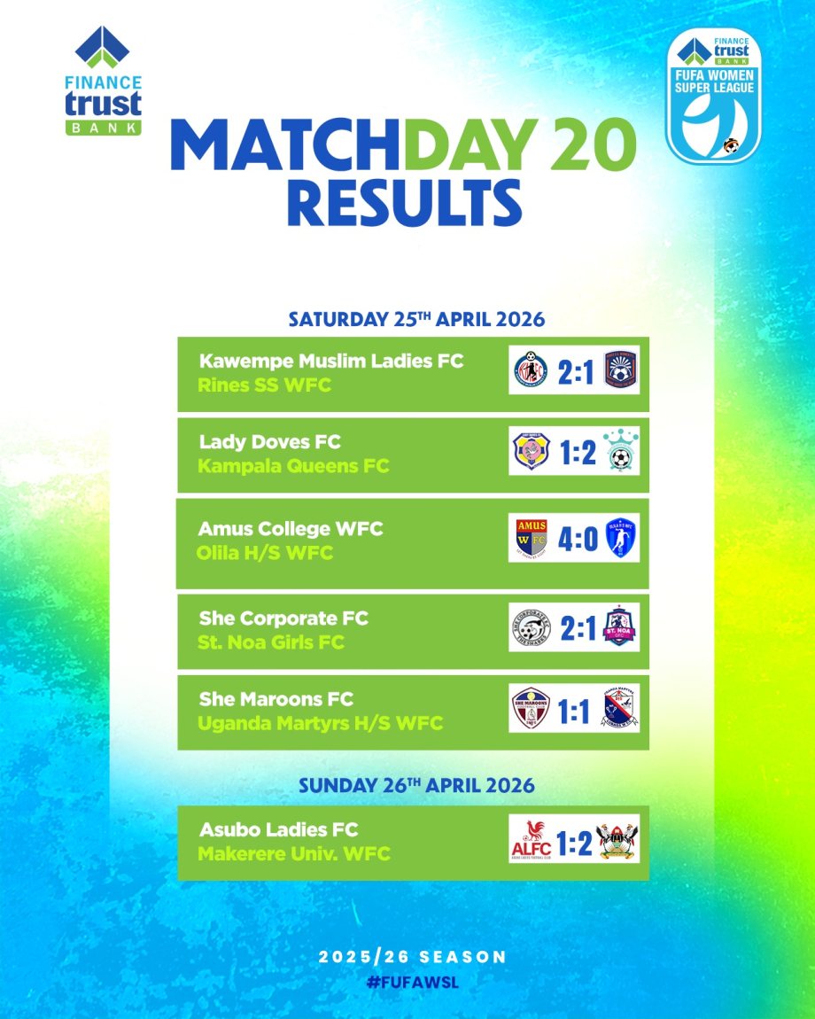 Matchday 20 concluded on Sunday at Kampala Quality Ground, where Makerere University WFC secured a 2-1 victory over Asubo Ladies FC in a tightly contested encounter. Sherina Nantongo gave Asubo Ladies FC hope with a goal, but Allen Nassazi and Nabede Fungo responded to fire Makerere University WFC to another important win.