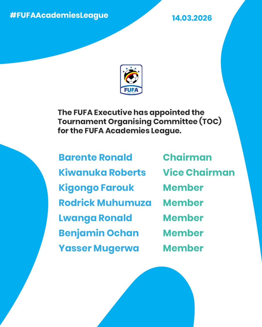 The FUFA Executive Committee has appointed the Tournament Organising Committee (TOC) for the FUFA Academies League, with Barente Ronald as Chairman, Kiwanuka Roberts as Vice Chairman, and Kigongo Farouk, Rodrick Muhumuza, former National team players Lwanga Ronald, Benjamin Ochan and Yasser Mugerwa as members.