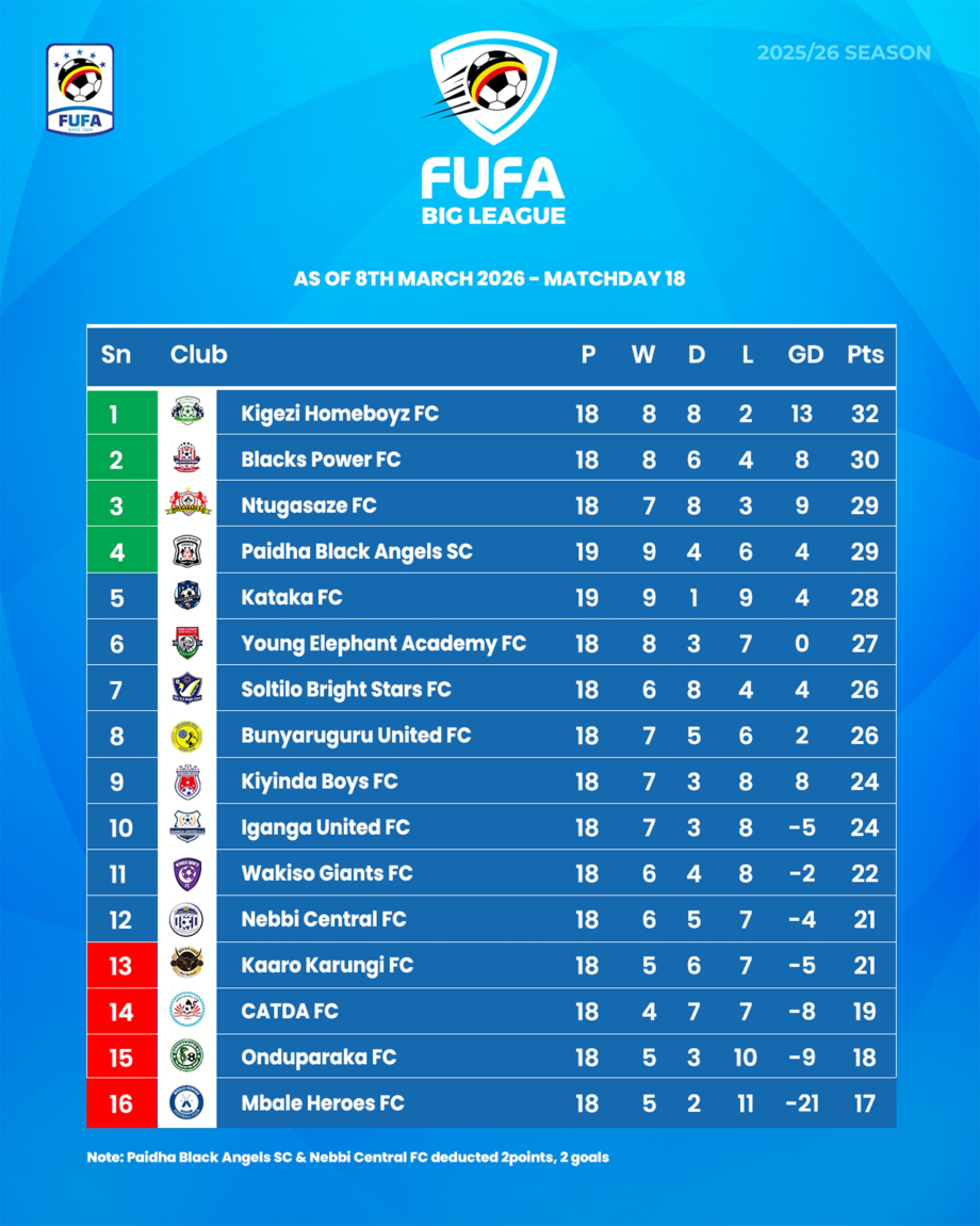 Kigezi Homeboyz FC lead the table with 32 points, while Blacks Power FC follow with 30 points. Ntugasaze FC and Paidha Black Angels SC both have 29 points, keeping the promotion race tight.