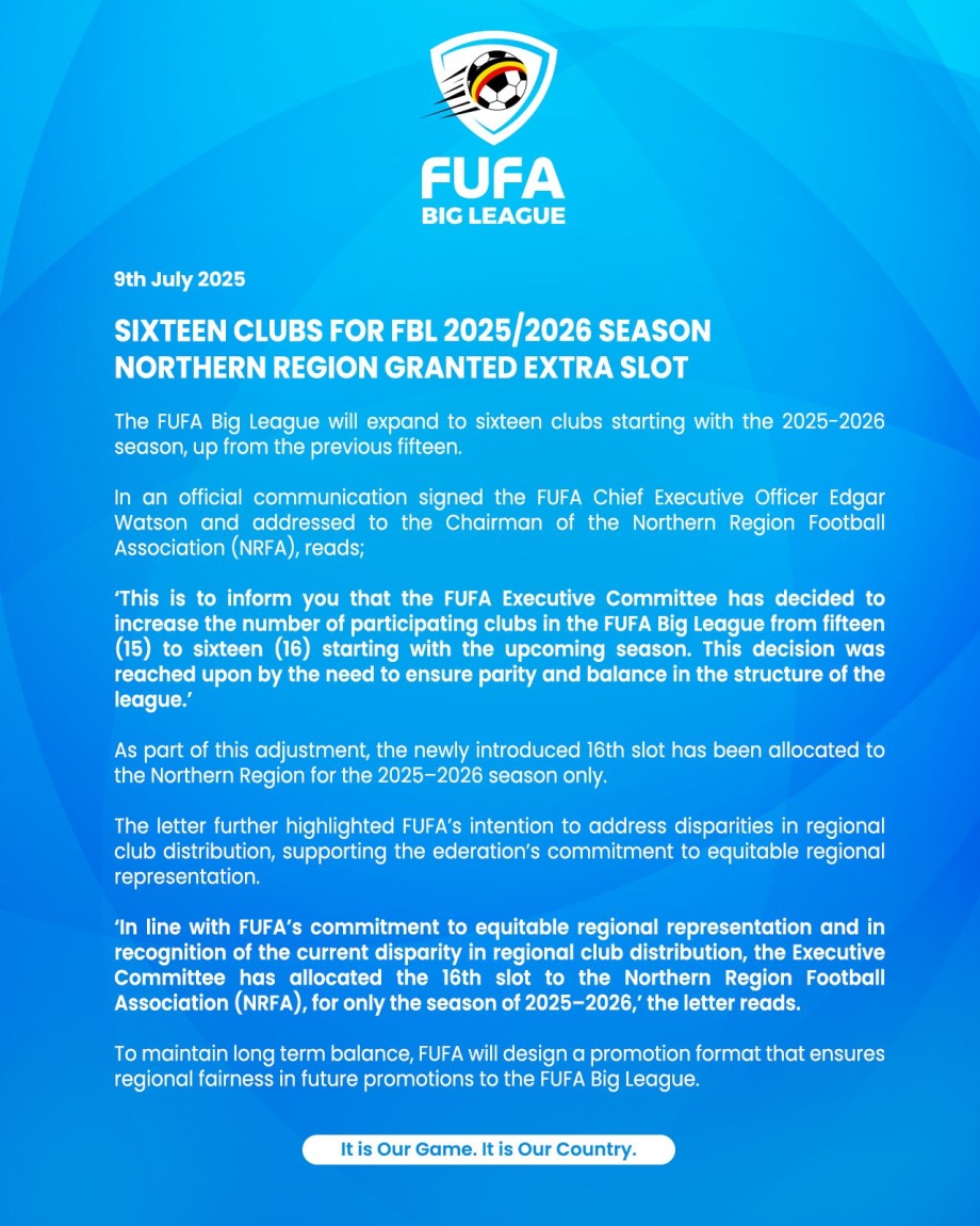 ‘In line with FUFA’s commitment to equitable regional representation and in recognition of the current disparity in regional club distribution, the Executive Committee has allocated the 16th slot to the Northern Region Football Association (NRFA), for only the season of 2025–2026,’ the letter reads.