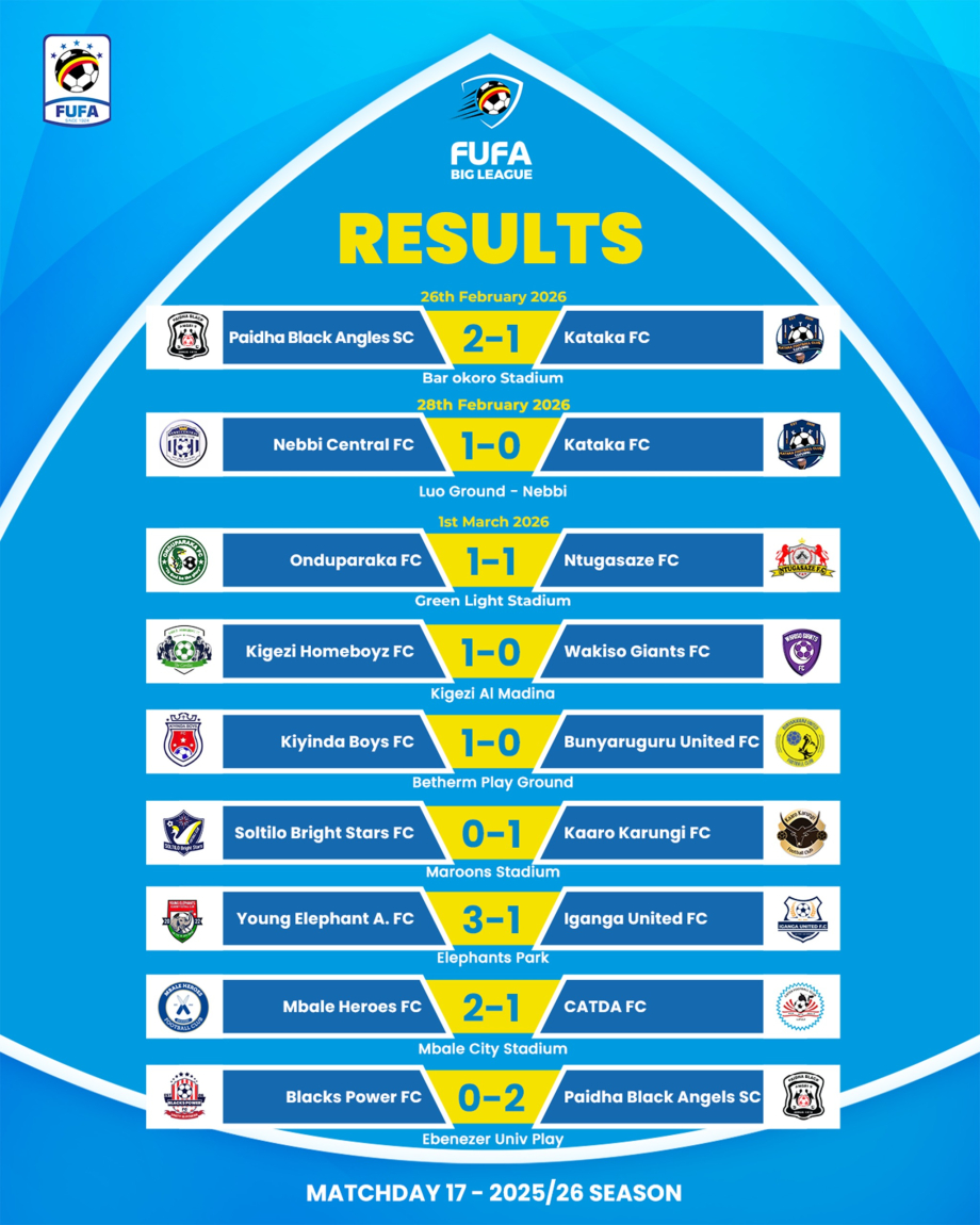 There was also a crucial win for Mbale Heroes FC, who defeated CATDA FC 2–1 to boost their survival hopes. Meanwhile, Nebbi Central FC registered a 1–0 victory over Kataka FC, and Kaaro Karungi FC claimed an important 1–0 away win against Soltilo Bright Stars FC.