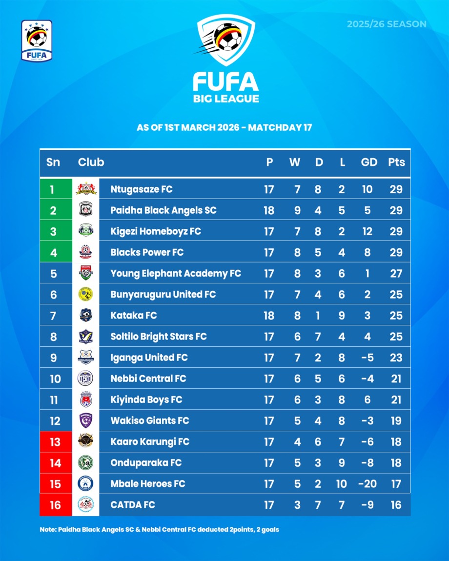 The results have tightened the standings considerably, with four clubs now level on 29 points. Ntugasaze FC, Paidha Black Angels SC, Kigezi Homeboyz FC and Blacks Power FC are separated only by head-to-head ranking as defined by the FUFA Competition Rules 2025.