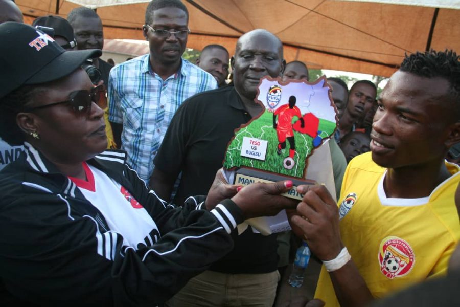 Bugisu goalkeeper receiving a Man of the Match accolade from Mbale Women MP Hon. Connie Nakayenze Galiwango in Soroti