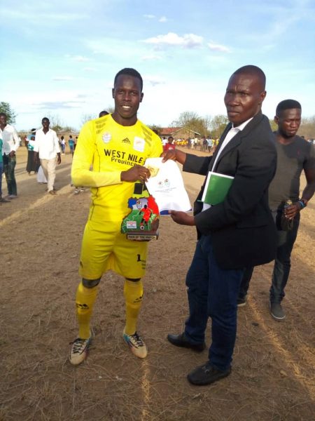 West Nile Province goalkeeper Alioza Nafian receiving Man of the Match Accolade from FUFA Estates Manager Edward Kalungi