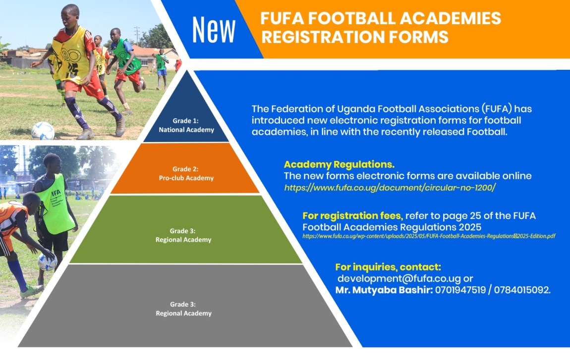 The Federation of Uganda Football Associations (FUFA) has introduced new electronic registration forms for football academies, in line with the recently released Football Academy Regulations (1st Edition, 2025).