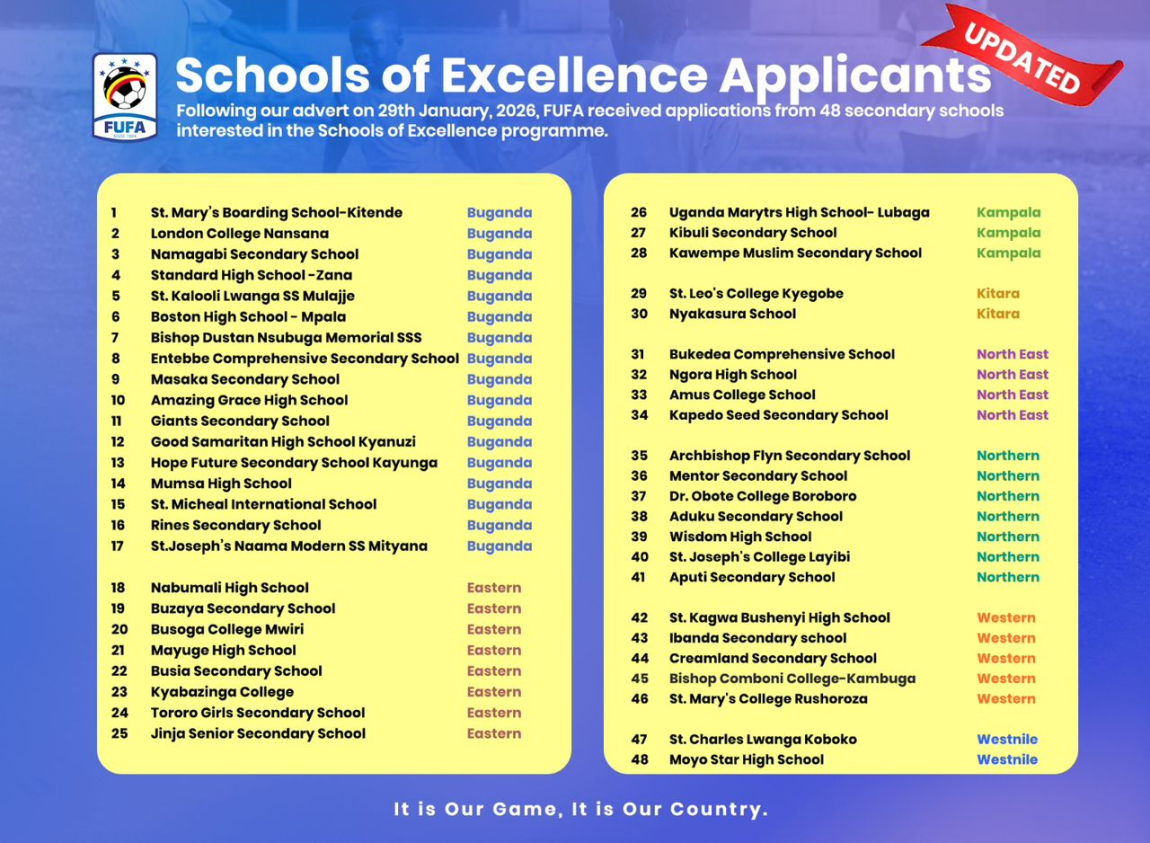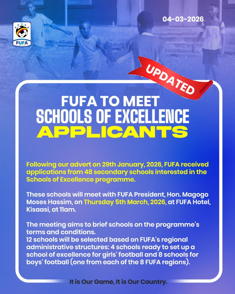 Following our advert on 29th January, 2026, FUFA received applications from 48 secondary schools interested in the Schools of Excellence programme. These schools will meet with FUFA President, Hon. Magogo Moses Hassim, on Thursday 5th March, 2026, at FUFA Hotel, Kisaasi, at 11am.