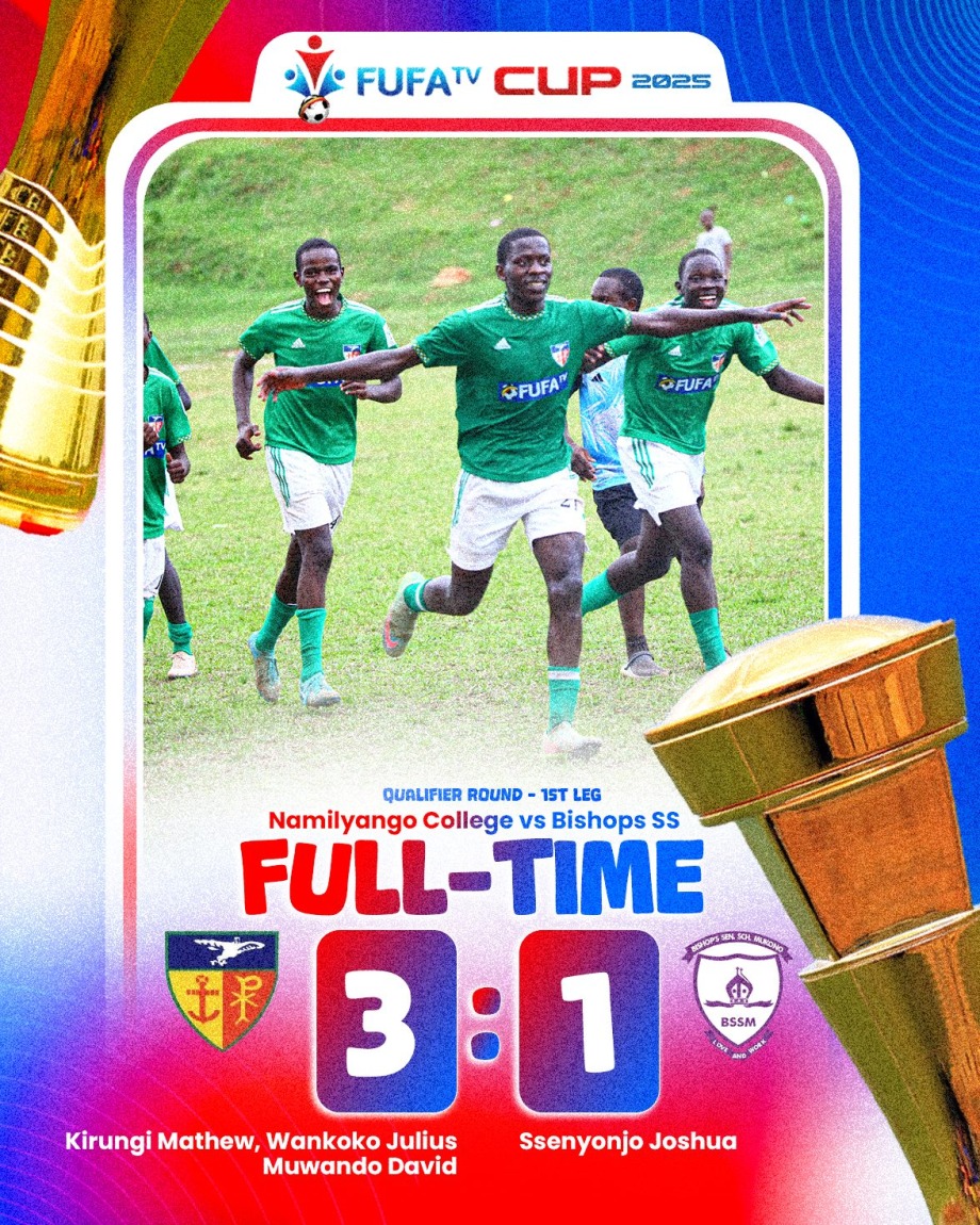 One of the standout performances of the day came from Namilyango College, who swept aside Bishop’s SS 3–1 in a game filled with attacking brilliance. Goals from Kirungi Mathew, Wankoko Julius and Muwando David fired the hosts to a memorable win. Although Ssenyonjo Joshua pulled one back for Bishop’s SS, it was only a consolation as Namilyango controlled the tie.