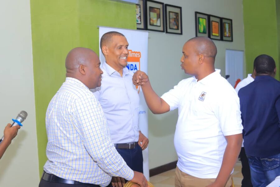 Uganda Premier League CEO Bernard Bainamani, League Manager Paul Kabaikaramu (White T Shirt) and FUFA CEO, Edgar Watson having a chat.