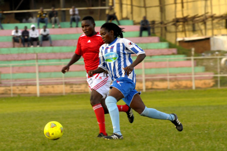MAIN PHOTO: Kawempe Muslim’s Habiiba Namaalwa in action against Buikwe’s Hajara Agaba in the 2015 FUFA Women Elite League finals at Nakivubo stadium