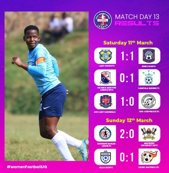 Elsewhere, Rines picked a point off Last Doves on the road. Sumaya Nsisi scored for the home side while Phiona Arach got the goal for Rines.