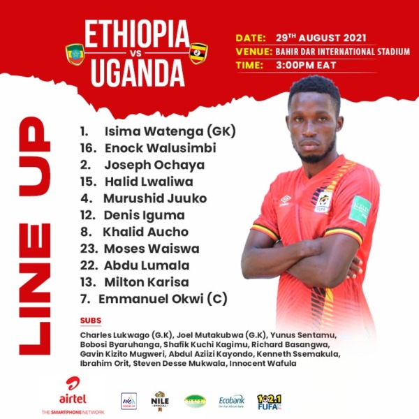 Isima Watenga starts in goal; debutant Enock Walusimbi is at right back and Joseph Benson Ochaya at left back.