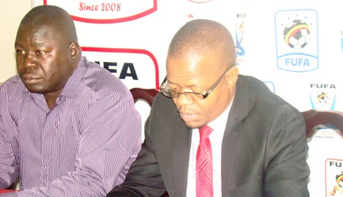 MAIN PHOTO: FUFA President, Eng Moses Magogo, flanked by the FUFA Licensing Committee chairperson, Dr. Bernard Patrick Ogwel during the Wednesday weekly press conference at FUFA House in Mengo.
