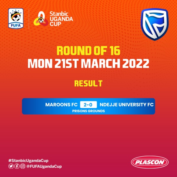 Maroons Football Club overcame fellow StarTimes FUFA Big League side Ndejje University 2-0 home at the Prisons Stadium in Luzira during a Stanbic Uganda Cup round of 16 encounter on Wednesday, March 23, 2022.