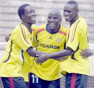 L-R: Denis Guma, Geoffrey Massa and Cranes Captain Andrew Mwesigwa. Massa has been ruled out of the Angola game due to an injury