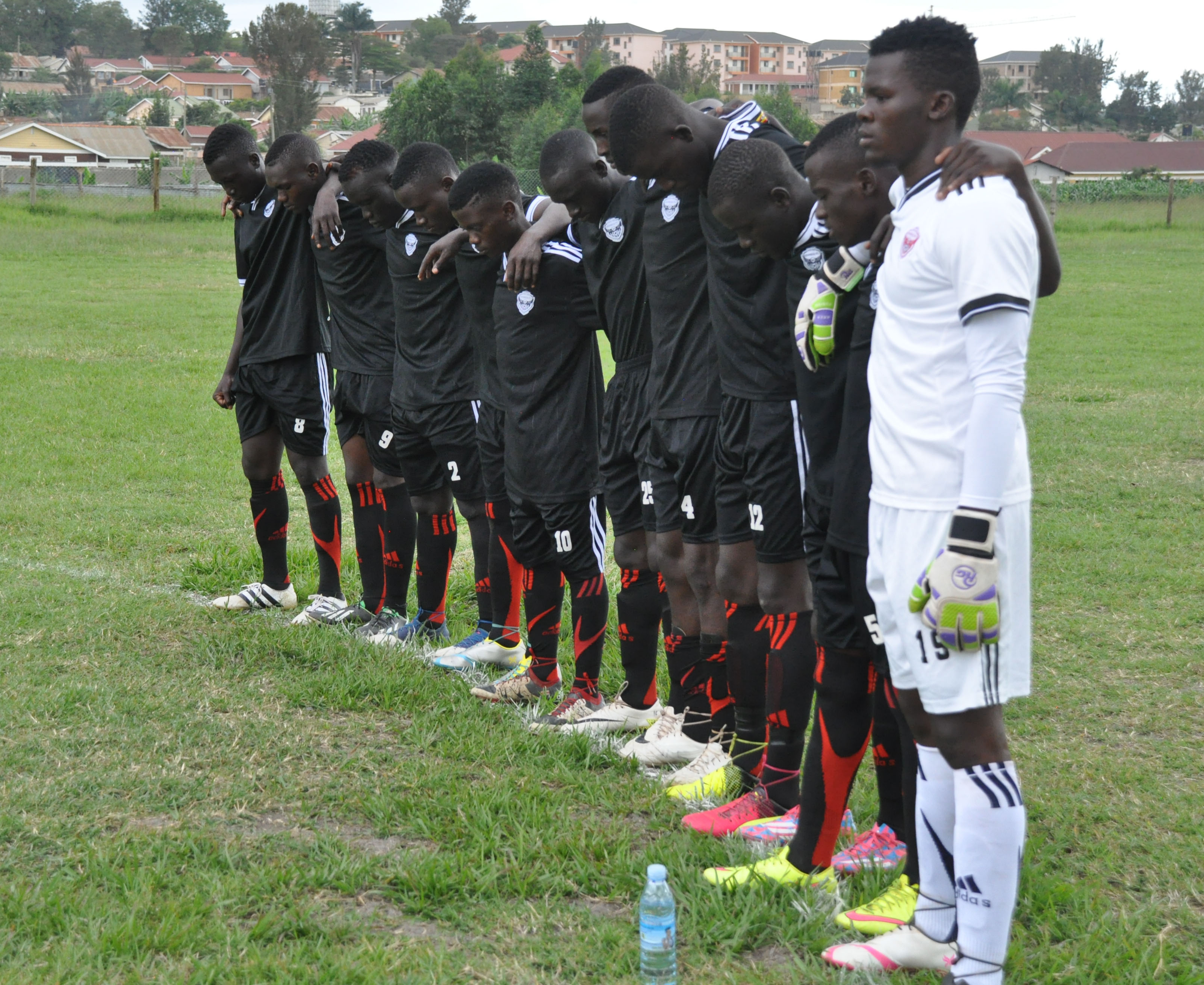 MAIN PHOTO: Mbarara City FC Junior Team players observing a moment of silence before the FUFA Junior League match