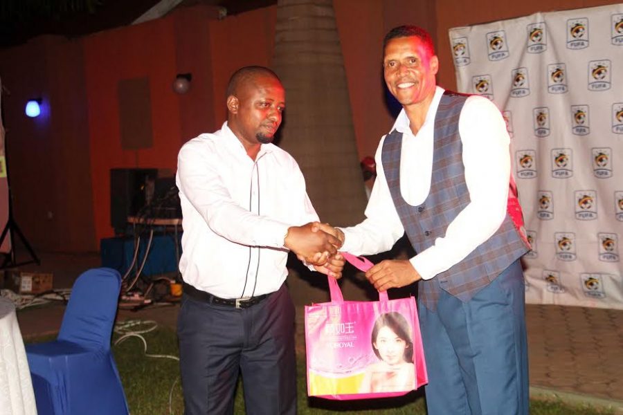 ← Previous image Next image → mugoye_watson FUFA second VP Darius Mugoye hands over a special gift to the FUFA CEO, Edgar Watson during the FUFA Staff party
