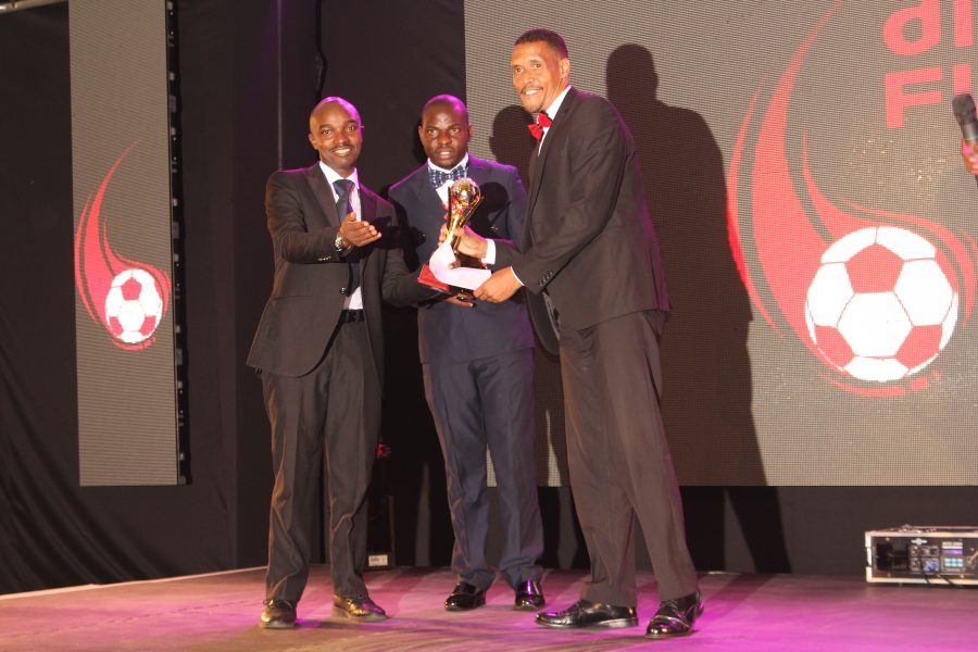 FUFA Chief Executive Officer, Edgar Watson recieves Muhammed Salah’s award (fans favourite players of the year – non Uganda)