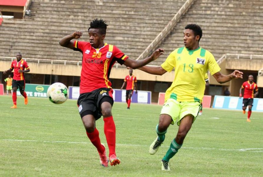 Uganda Cranes winger Milton Karisa (23) shields the ball away from Sao Tome and Principe’s Dilson Quaresma