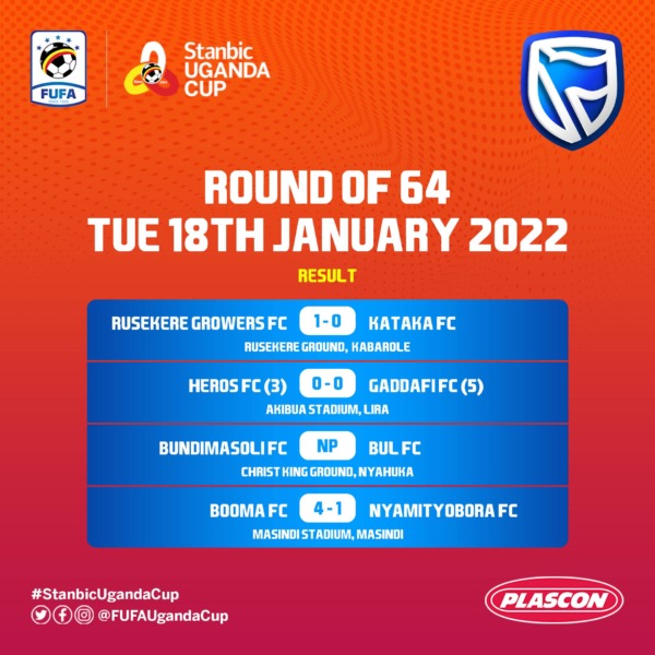 Rusekere Growers, Gaddafi and Booma are through following respective victories at the stage of 64 on Tuesday, January 18, 2022.