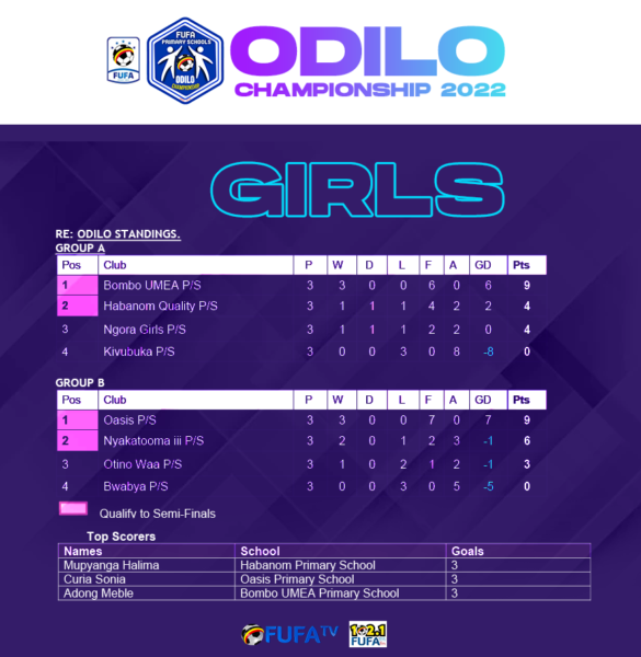 Mupyangu Halima of Habanon Quality, Ciria Sonia of Oasis Primary School, and Adong Meble of Bombo UMEA Primary School leading the scorer’s chart with three goals each.