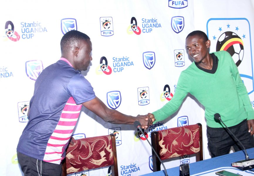 MAIN PHOTO: KCCA assistant manager Morley Byekwaso and Synergy’s Brian Ssenyondo greet after the press conference at FUFA House in Mengo, Kampala.
