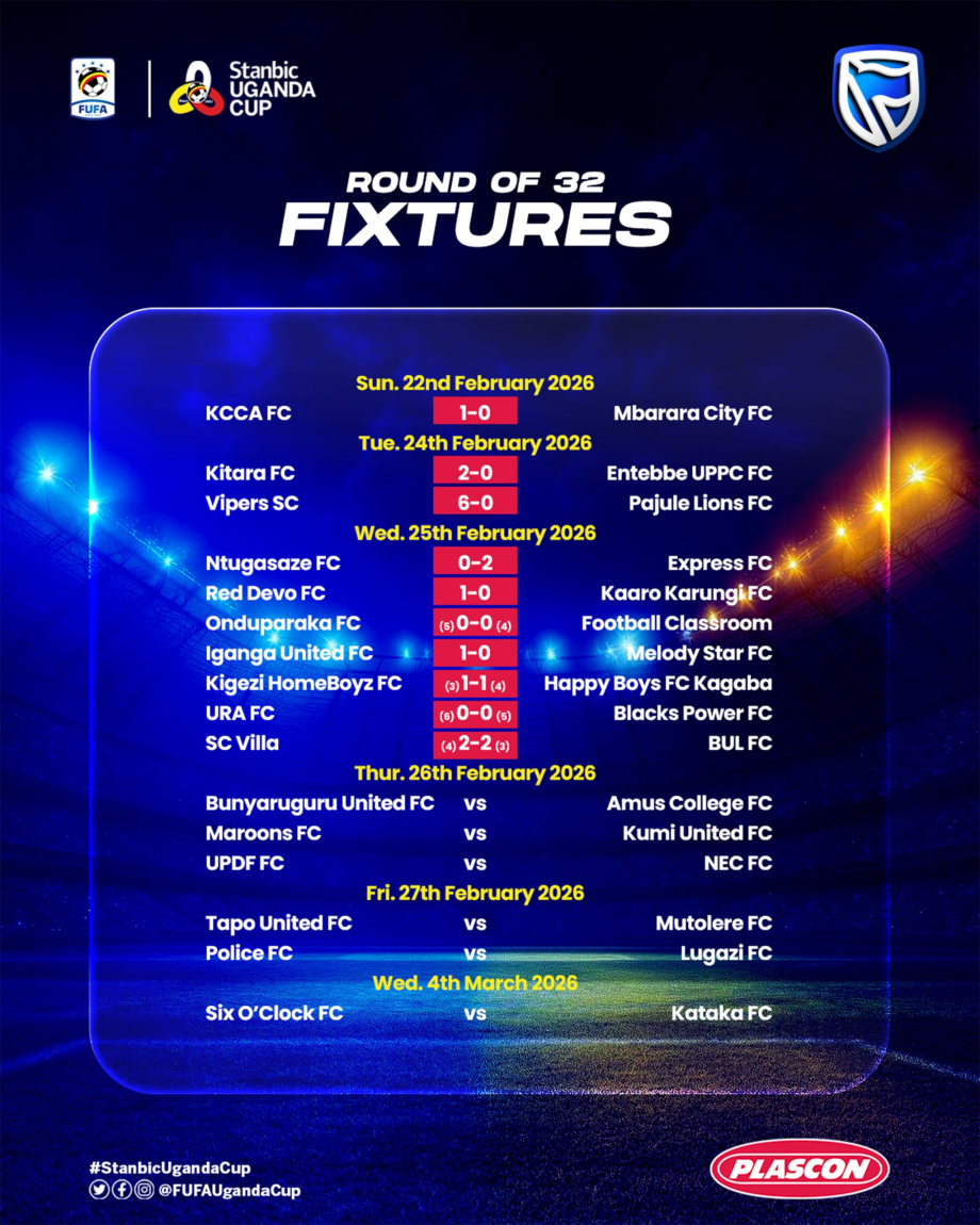 Wednesday’s Stanbic Uganda Cup Round of 32 fixtures delivered a blend of decisive wins and dramatic penalty shootouts as several teams battled for places in the Round of 16.
