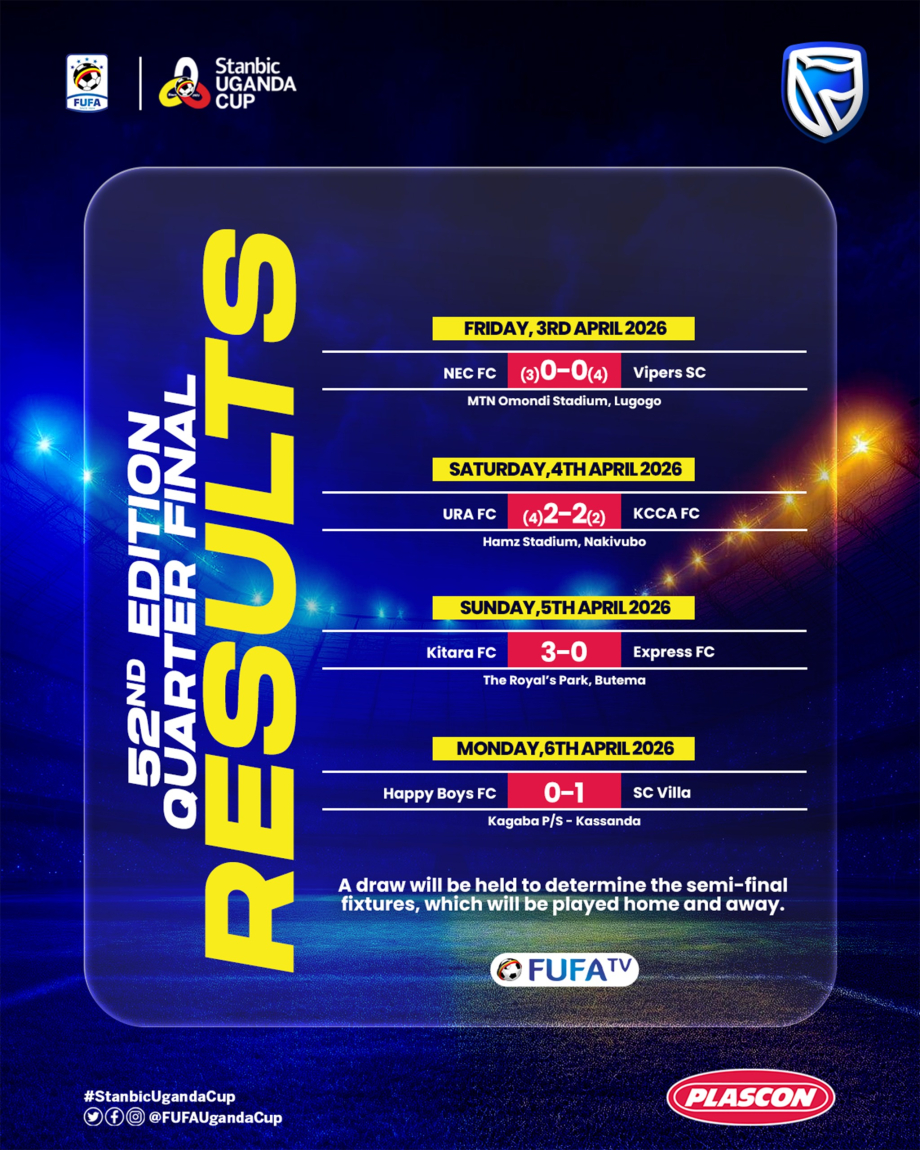 The semi-finalists for the Stanbic Uganda Cup have been confirmed following the conclusion of the quarter-final matches played across different venues from 3rd to 6th April 2026.