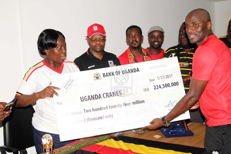 ← Previous image Next image → FM5 Speaker hands over a dummy cheque to Geofrey Massa, the team captain