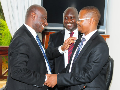 FUFA President Eng. Moses Magogo (R), FUFA Honorary President Lawrence Mulindwa (C) and CECAFA President Eng. Leodgar Tenga in Jinja, Uganda during the FUFA elections in August.