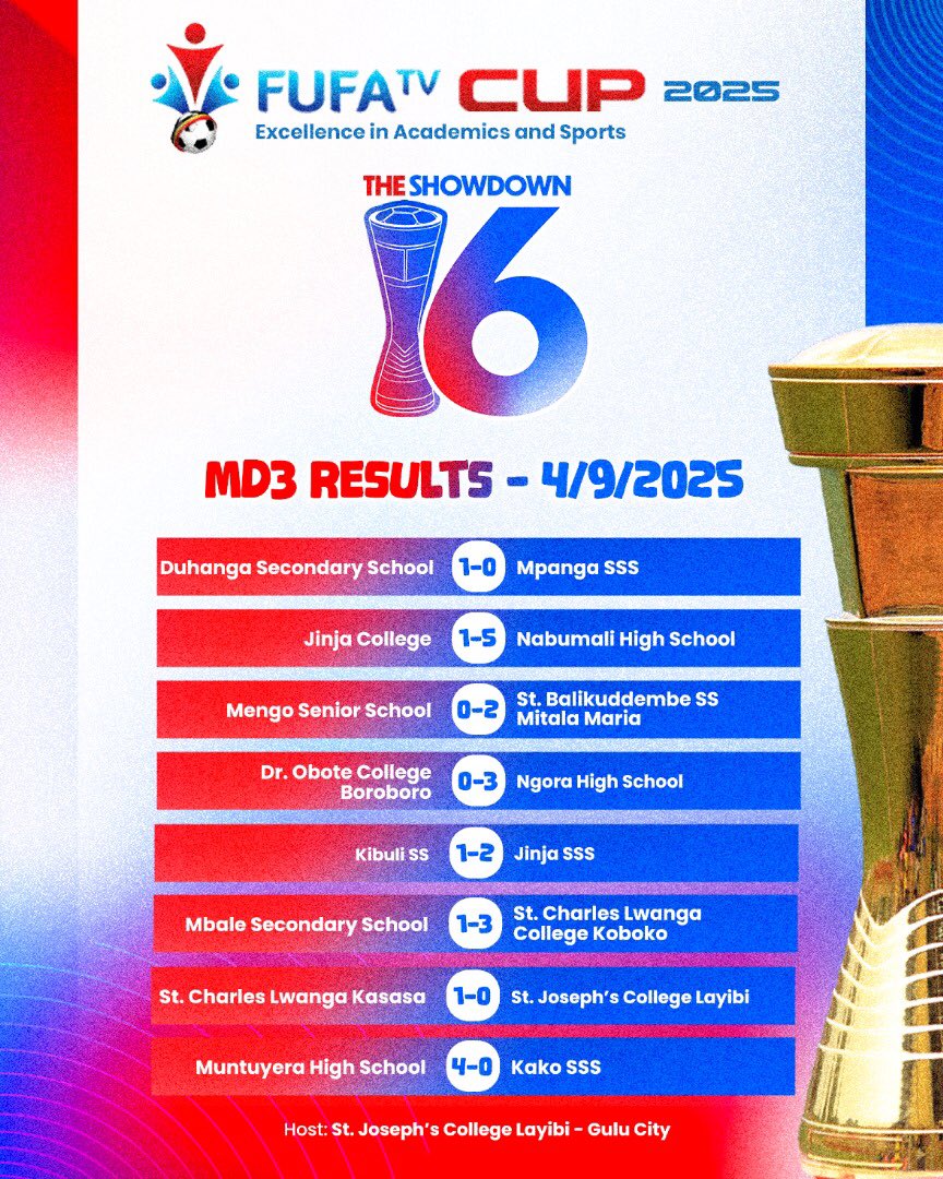 Group D proved just as lively, with Jinja SSS defeating Kibuli SS 2-1, while St. Charles Lwanga Koboko secured their first points by overcoming Mbale SS 3-1.