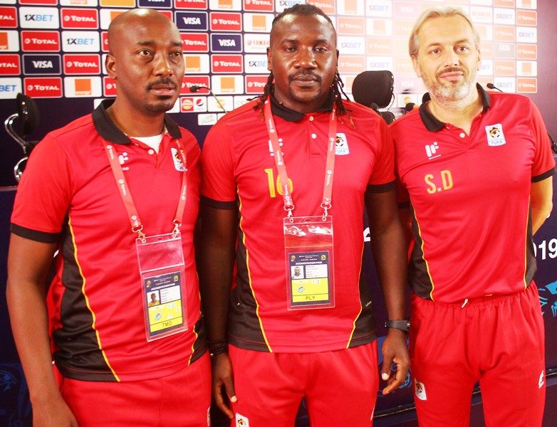 L-R: Ahmed Hussein (FUFA Communications manager), Hassan Wasswa Mawanda (Vice Captain Uganda Cranes) and Uganda Cranes head coach Sebastien Desabre pose for a group photo after the pre-match press conference at Cairo International Stadium on Saturday