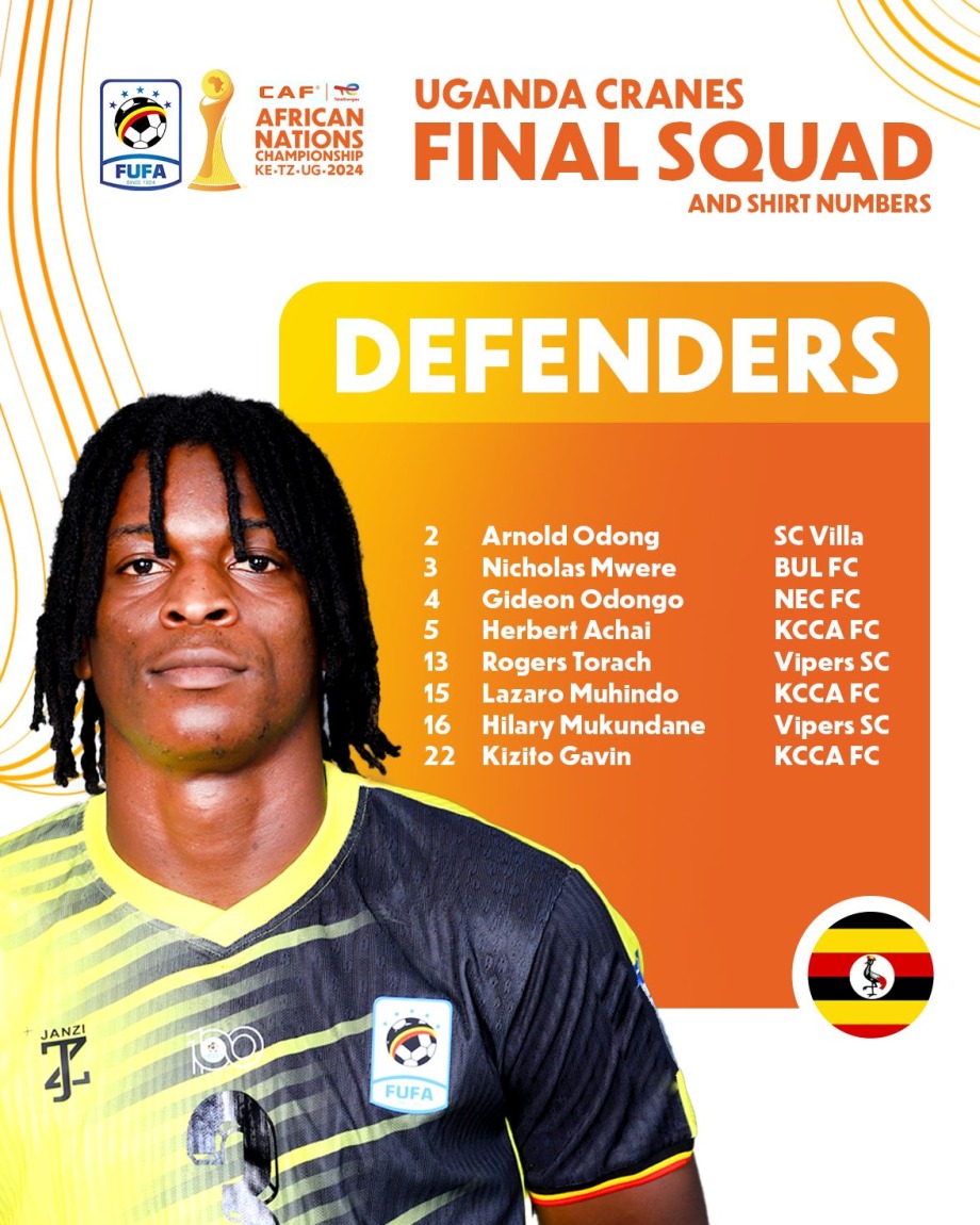 Defenders: 2 Arnold Odong (SC Villa), 3 Nicholas Mwere (BUL FC), 4 Gideon Odong (NEC FC), 5 Herbert Achai (KCCA FC), 13 Rogers Torach (Vipers SC), 15 Lazaro Muhindo (KCCA FC), 16 Hilary Mukundane (Vipers SC) and 22 Kizito Gavin (KCCA FC)